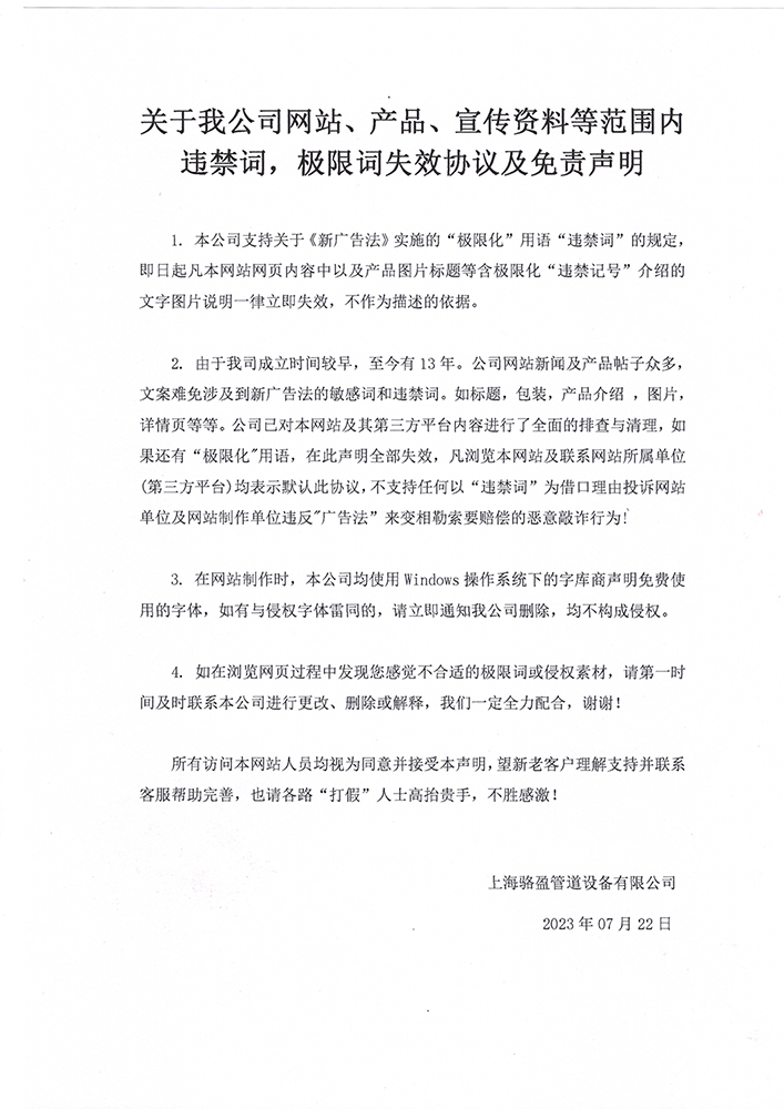 關于我公司網(wǎng)站、產(chǎn)品、宣傳資料等范圍內(nèi)違禁詞,極限詞失效協(xié)議及免責聲明 ?