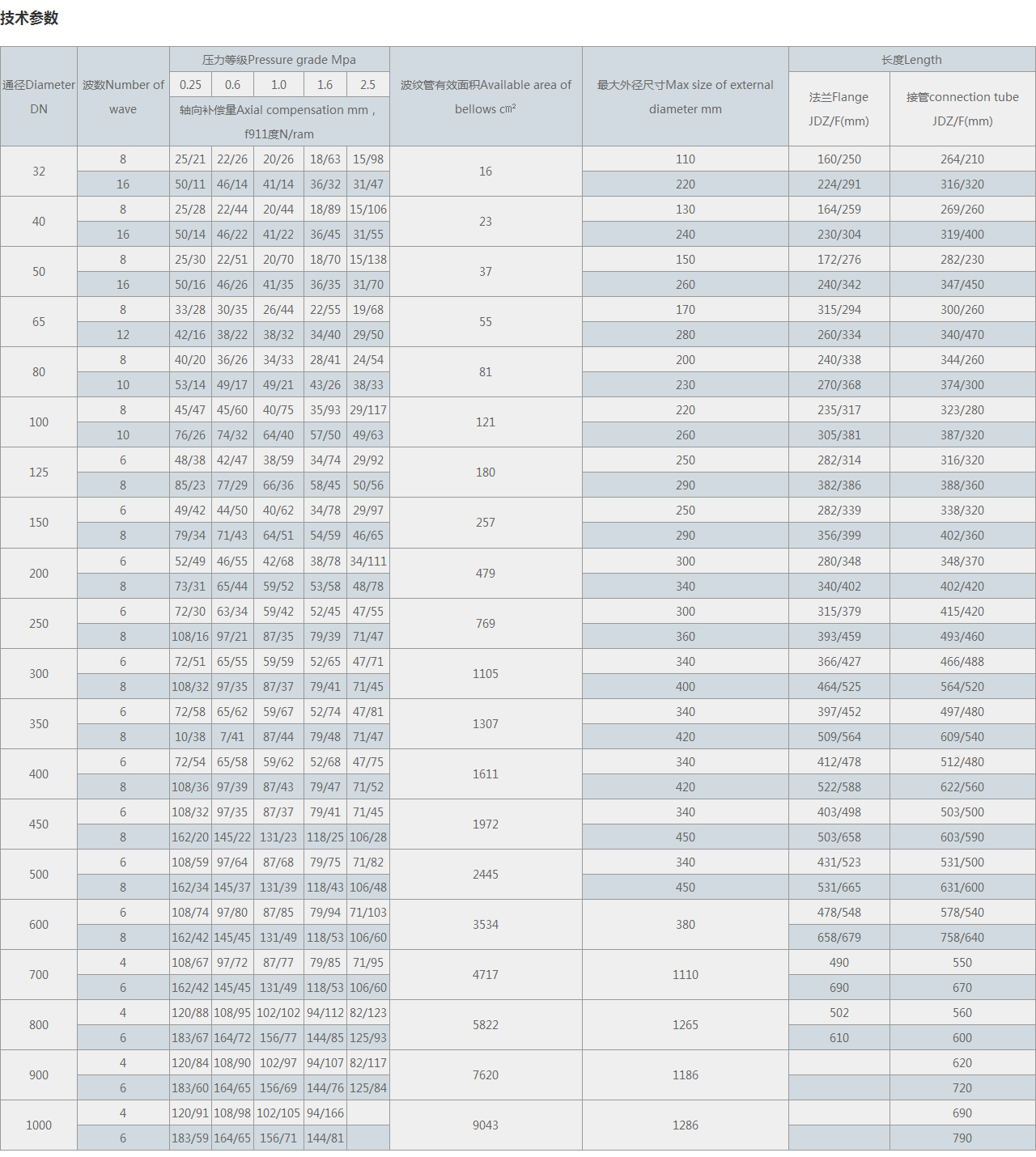 通徑Diameter DN 波數(shù)Number of wave 壓力等級Pressure grade Mpa 波紋管有效面積Available area of bellows c㎡ 很大外徑尺寸Max size of external diameter mm 長度Length