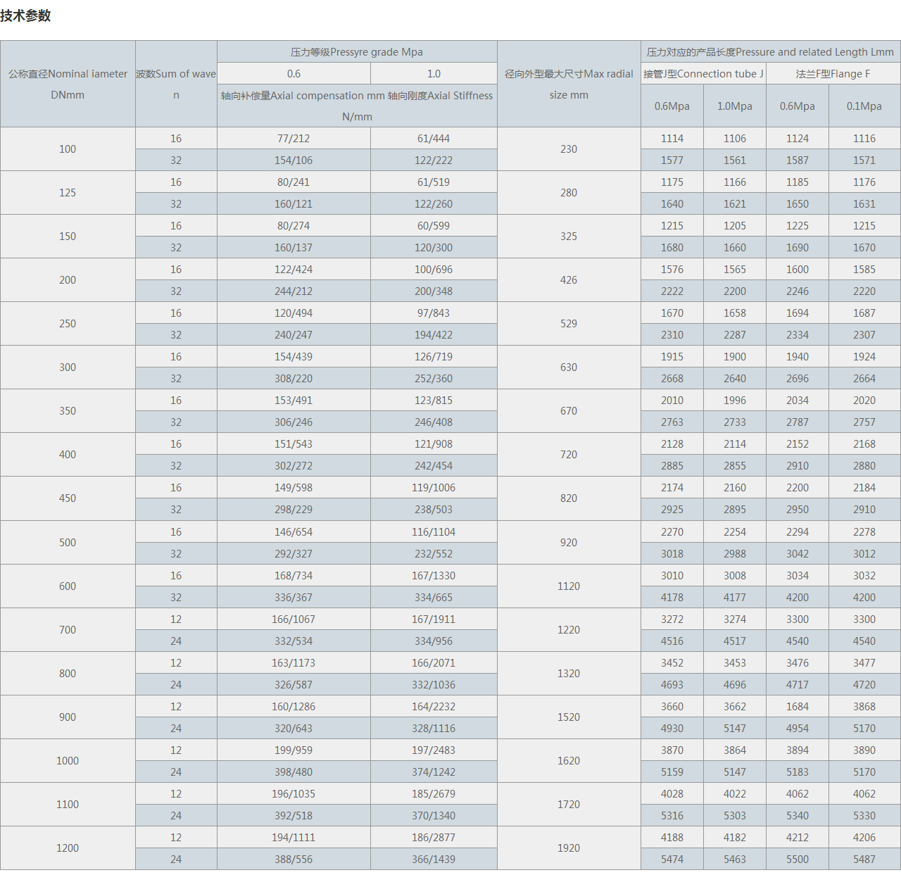 公稱直徑Nominal iameter DNmm 波數(shù)Sum of wave n 壓力等級Pressyre grade Mpa 徑向外型很大尺寸Max radial size mm 壓力對應(yīng)的產(chǎn)品長度Pressure and related Length Lmm