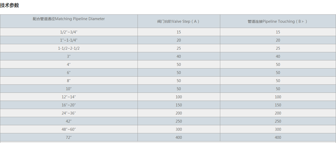 | 配合管道通徑Matching Pipeline Diameter | 閥門(mén)臺(tái)階Valve Step(A) | 管道連接Pipeline Touching(B>) |