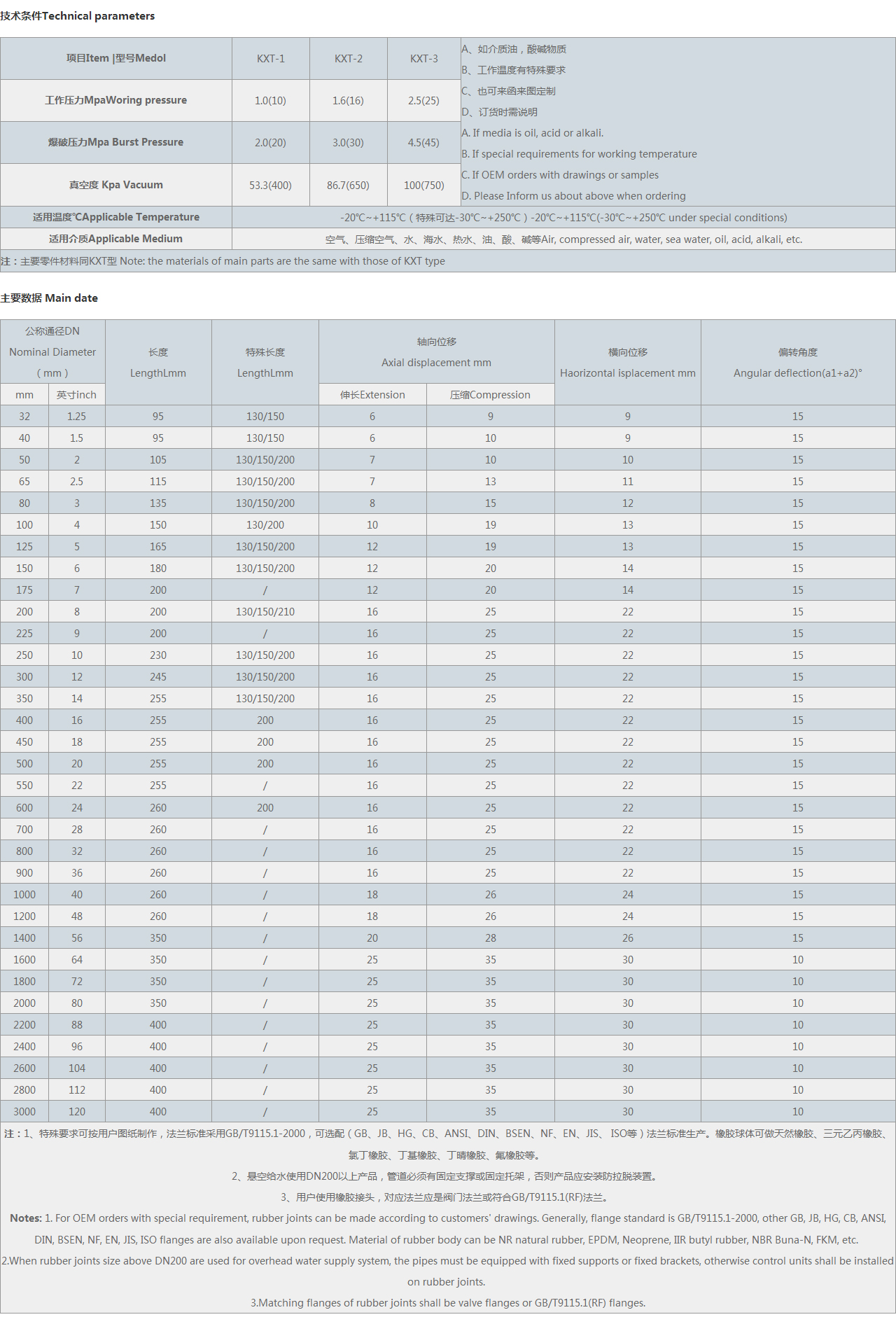 Notes: 1. For OEM orders with special requirement, rubber joints can be made according to customers' drawings. Generally, flange standard is, other GB, JB, HG, CB, ANSI, DIN, BSEN, NF, EN, JIS, flanges are also available upon request. Material of rubber body can be NR natural rubber, EPDM, Neoprene, IIR butyl rubber, NBR Buna-N, FKM, etc.