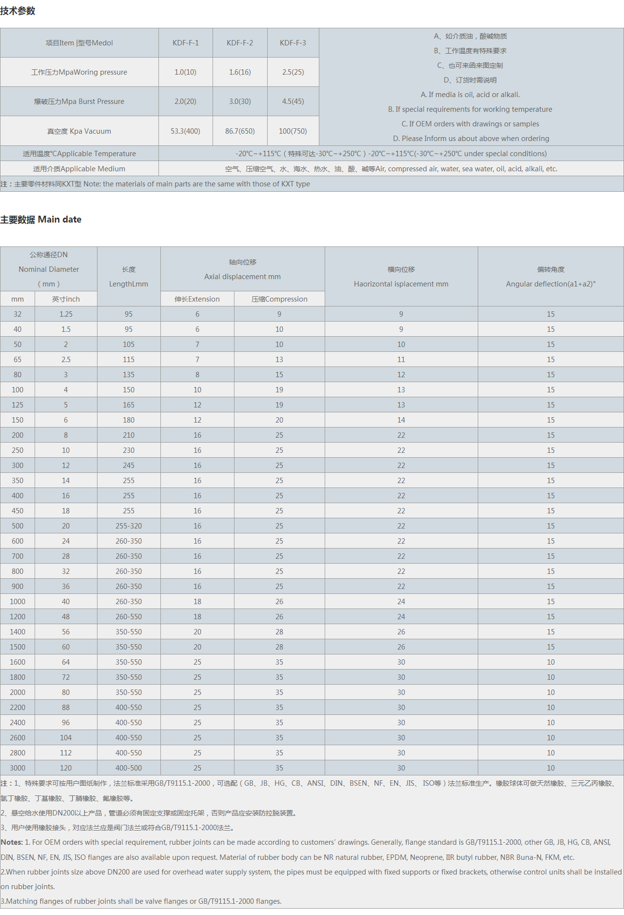 Notes: 1. For OEM orders with special requirement, rubber joints can be made according to customers' drawings. Generally, flange standard is , other GB, JB, HG, CB, ANSI, DIN, BSEN, NF, EN, JIS, flanges are also available upon request. Material of rubber body can be NR natural rubber, EPDM, Neoprene, IIR butyl rubber, NBR Buna-N, FKM, etc.