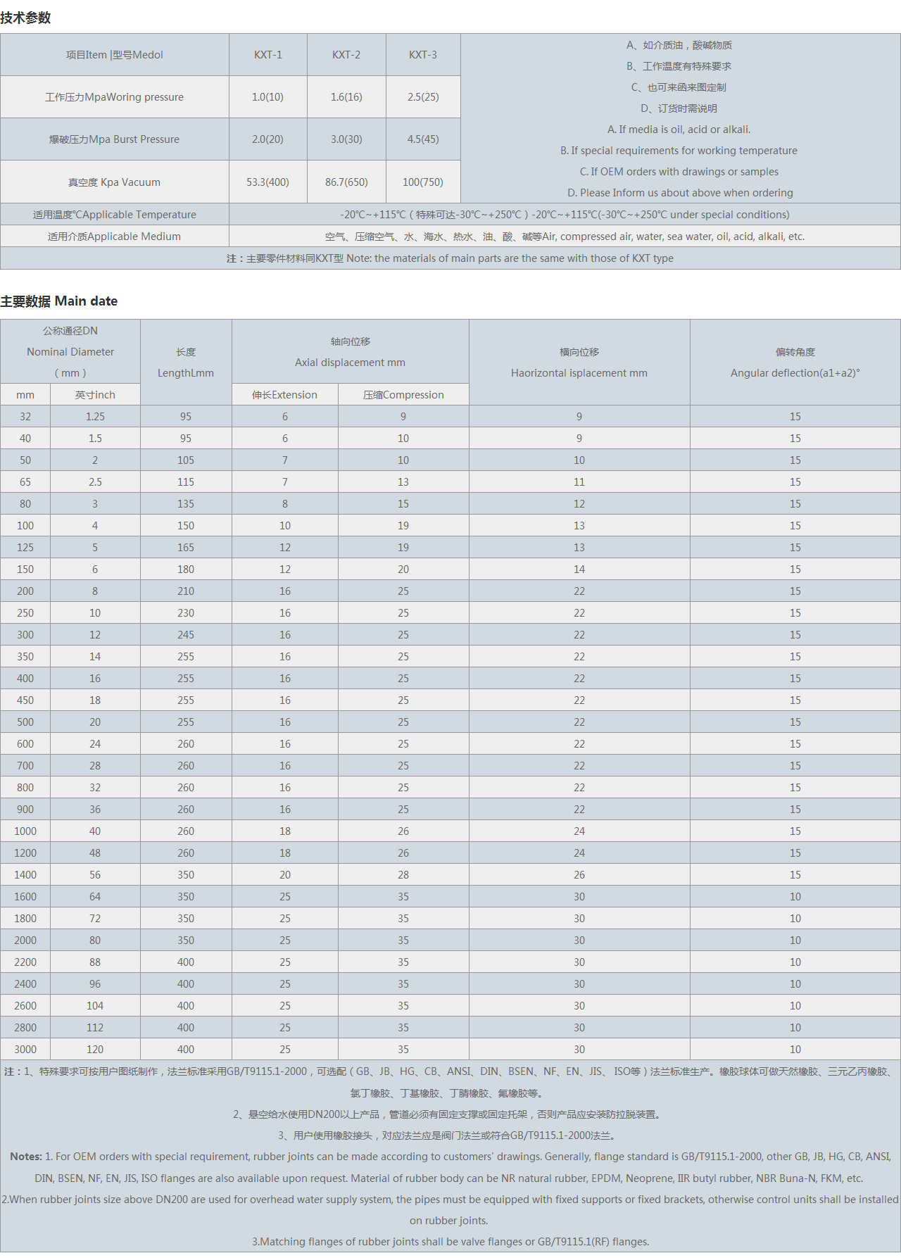 Notes: 1. For OEM orders with special requirement, rubber joints can be made according to customers' drawings. Generally, flange standard is, other GB, JB, HG, CB, ANSI, DIN, BSEN, NF, EN, JIS, flanges are also available upon request. Material of rubber body can be NR natural rubber, EPDM, Neoprene, IIR butyl rubber, NBR Buna-N, FKM, etc.